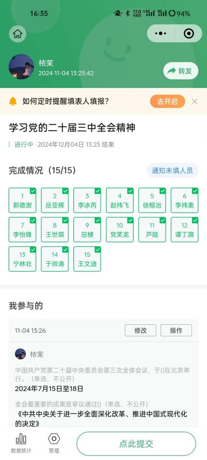 11月23日,为丰富学习形式,学生骨干制作相关链接开展线上答题活动,深化了对党的二十届三中全会精神的理解和认识,增强了党性修养和责任意识,营造出浓厚的学习氛围。