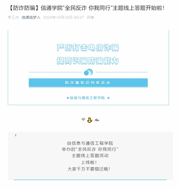 于2024年10月30日至2024年11月8日举办“全民反诈 你我同行”主题线上答题活动。各年级认真组织,活动截止时共有592名学生参与答题。