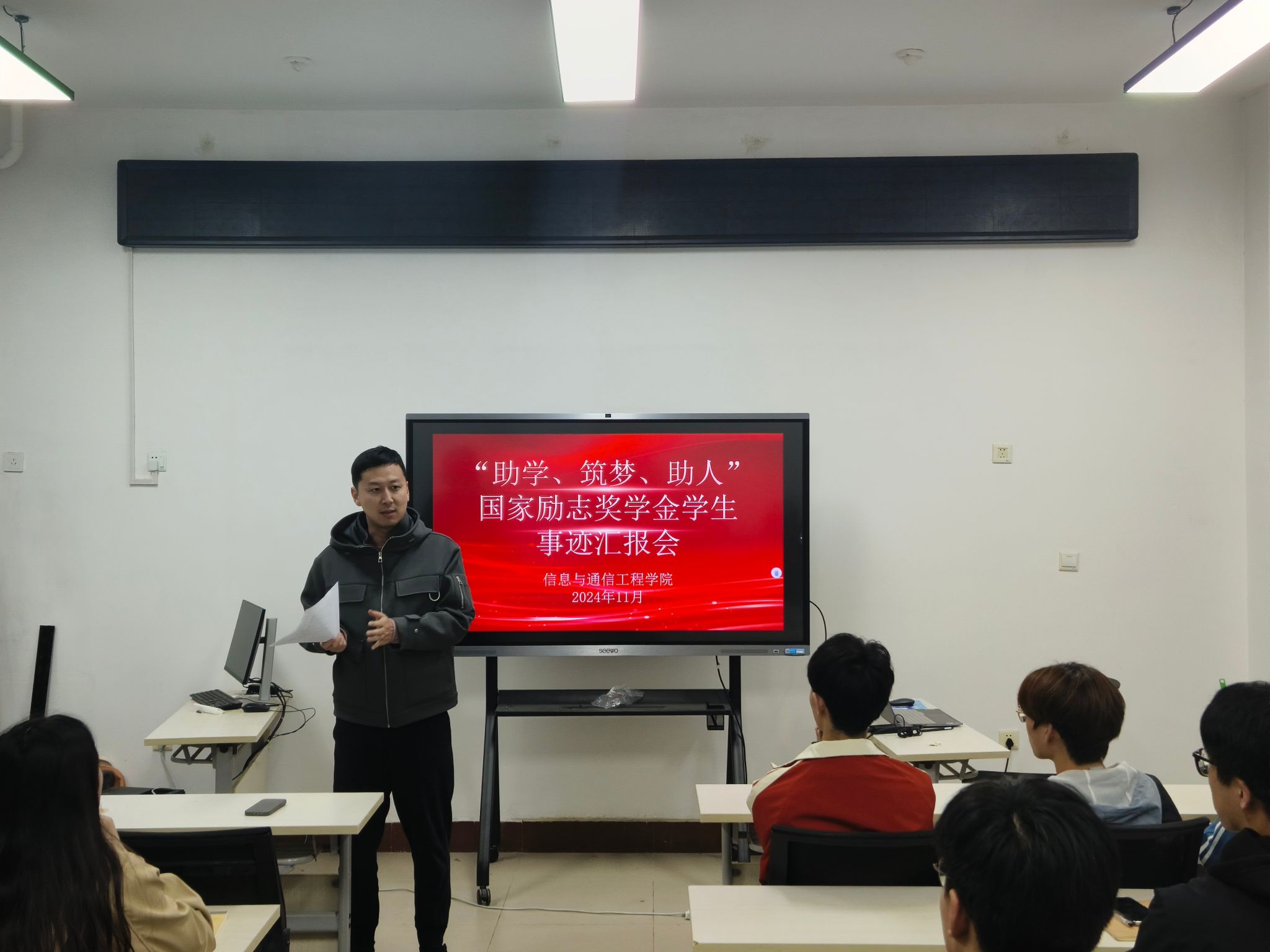 在10 号教学楼举办“助学、筑梦、助人”国家励志奖学金学生事迹汇报会,学工办辅导员、部分励志奖学金获得者和2024级学生代表参加本次活动。