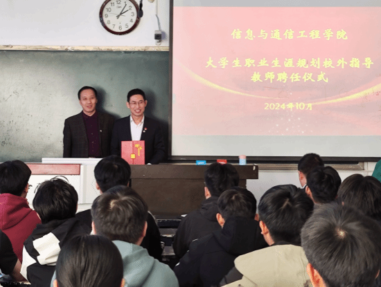 在龙湖校区举办职业生涯规划校外指导教师聘任仪式。测控2003级校友、新乡北方车辆仪表有限公司总经理范光华,学院党总支书记邹海林、执行院长李春雷、副书记王辉、工会主席路向阳出席,全体辅导员以及70余名学生代表参加本次活动。